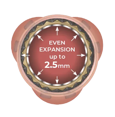 The inflow ring can be evenly and circumferentially expanded up to 2.5mm above its nominal size, which allows for hemodynamic advantages and greater compatibility with TAVI models and sizes.