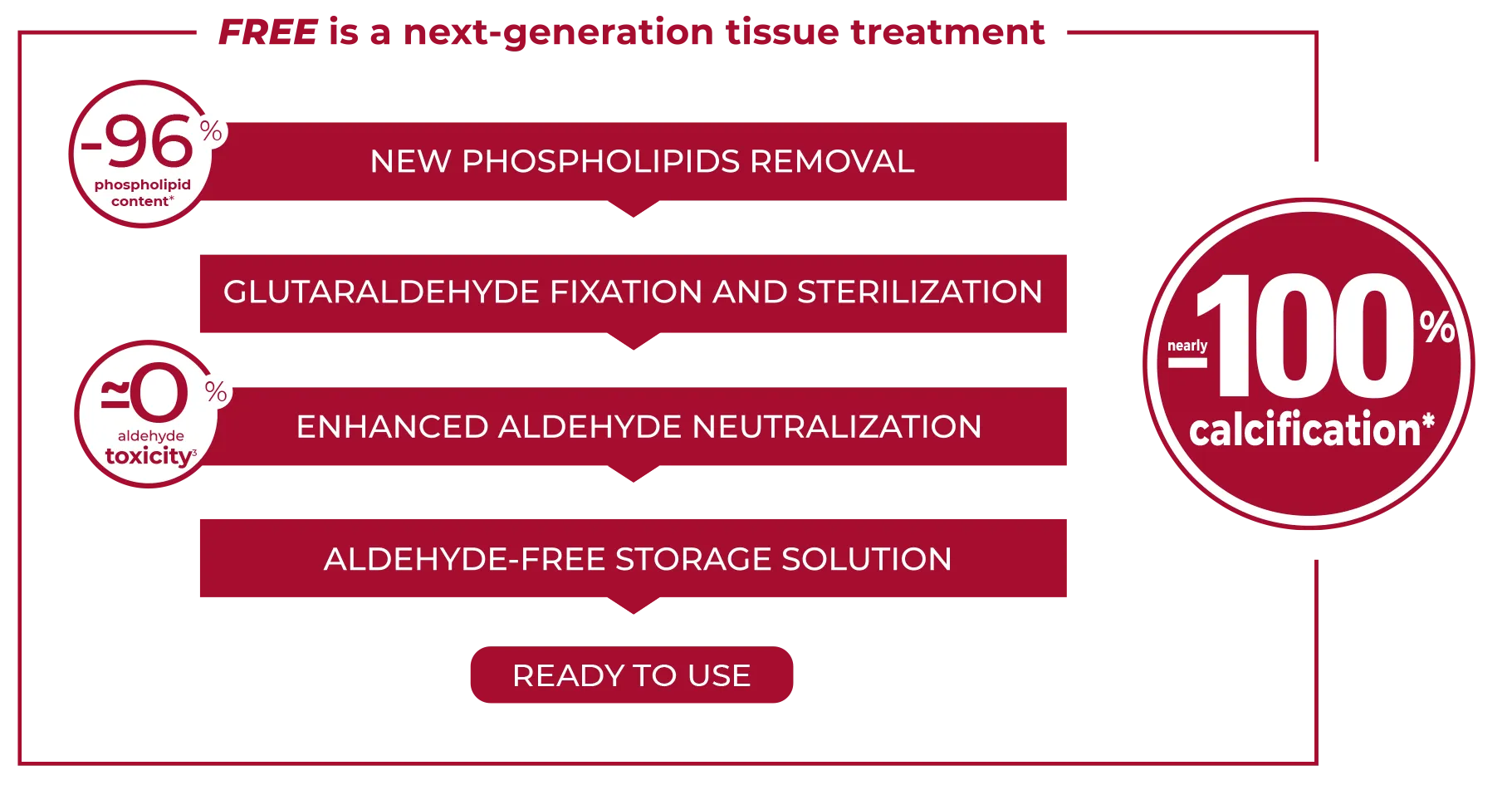 The innovative FREE Tissue Treatment in Perceval Plus addresses both major causes of valve calcification, phospholipids and aldehydes. The technology also allows the valve to be stored in an aldehyde-free solution, resulting in negligible toxicity for the patient and a faster procedure for the surgeon as no rinsing is required.3